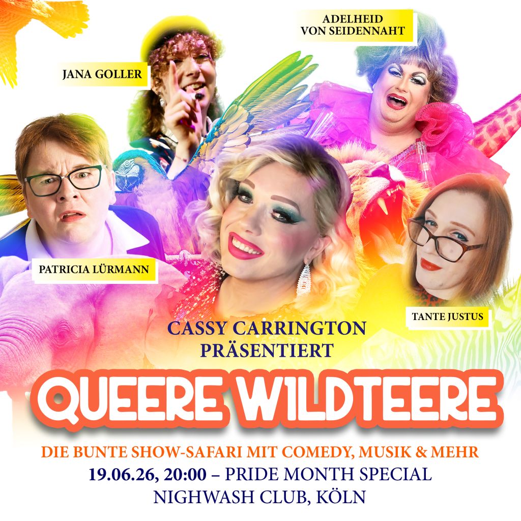 Die beliebte Kölner Drag-Queen, Entertainerin und Aktivistin Cassy Carrington lädt ein – und zwar einen bunten Mix an queeren Künstler*innen in ihr neues Showformat „Queere Wildteere“ – und es wird definitiv wild.